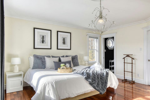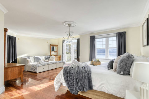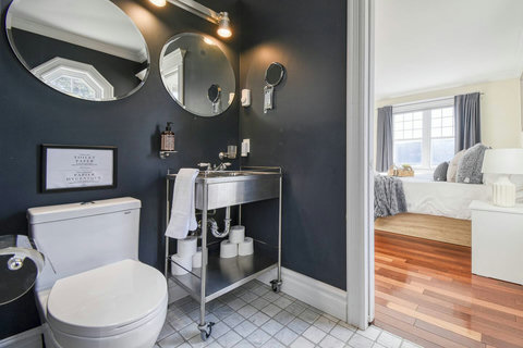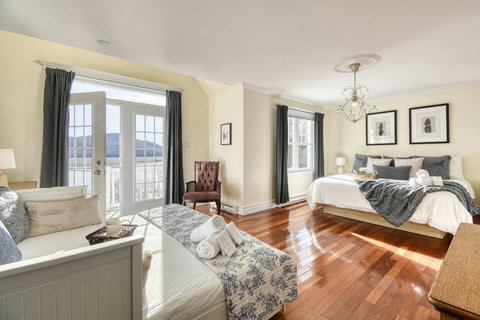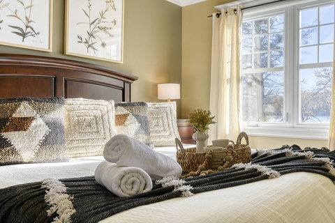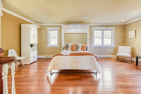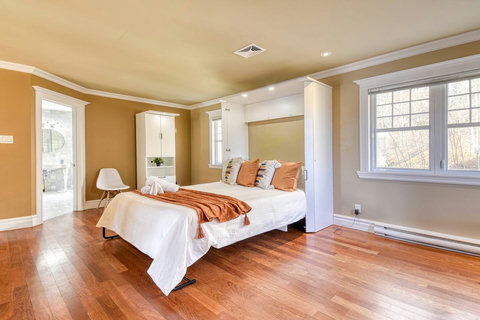 - Master Bedroom – King-size bed with private balcony access, ensuite half-bathroom, and a cozy Daybed that turns into a queen/king size when fully opened