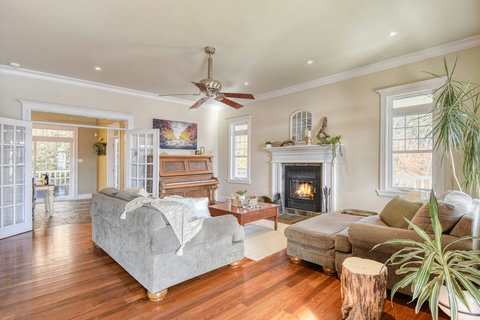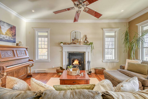 - Living Room – Features a wood fireplace and a piano