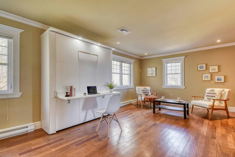 - Living Space (opened) – Includes a queen Murphy bed that turns into a workspace when closed