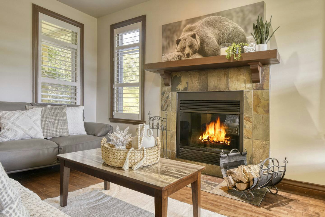 - Living room with fireplace and large flat screen (Entertainment: Netflix, Disney+, Amazon Prime Video included on TV)