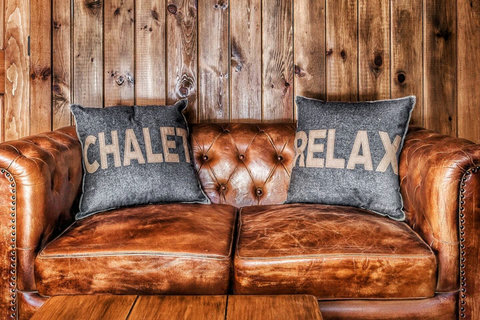 Main Living Room: Lounge by the gas fireplace, surrounded by luxurious leather sofas, high vaulted ceilings, and panoramic windows that flood the space with natural light.